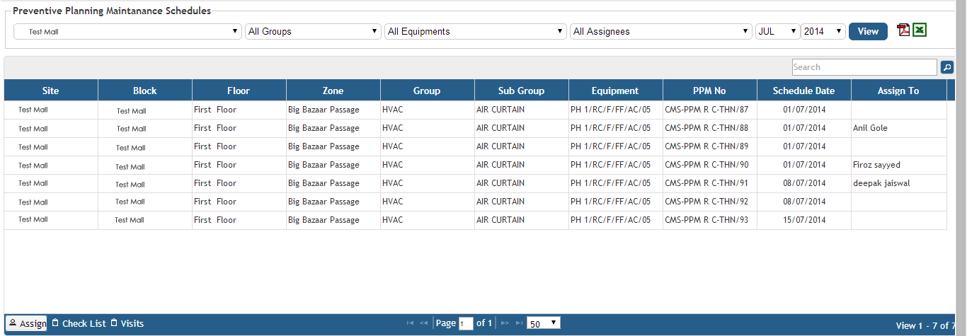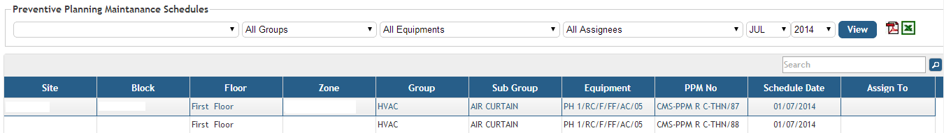 2. For assigning a PPM you have to select the PPM schedule selecting the suitable fields- Site, Group, Equipment, Name of the assignee, month and the year and click on View.